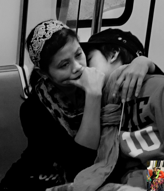 一個年青母親在地鐵上摟著半癰的兒子,雖苦但不放棄. 陪著你走, 一身一世也不分........