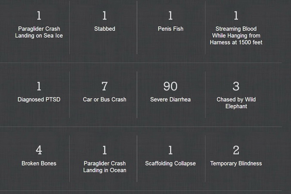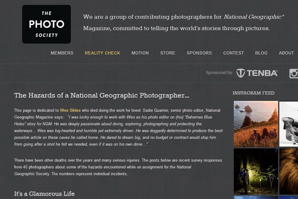「The Photo Society」是一個集合了國家地理雜誌攝影師的網站平台,他們可在網站上分享自己的作品,甚至拍攝經歷。大家都知道國家地理雜誌攝影師的工作,往往都是在陌生的野外環境下進行,其危險程度更是難以預料。攝影師就在網站上分享了一些近來曾發生在他們身上的糟糕狀況,原來最多發生的是「嚴重腹瀉」,其次有「軟禁」、「傷口感染」及「凍傷」等,而當中亦不乏罕見的情況,例如「直升機安全帶鬆開跌進火山」、「被 9000 磅海象攻擊」和「在岩壁失足 90 度直落墜下」等。由此亦看到他們如何為了工作,而一直賣命地付出,所以日後如果看到國家地理雜誌攝影師的作品時,大家也不妨多花點時間欣賞或給一個「讚」以嘉許。如果想知道他們更多其他的糟糕狀況,可到 「The Photo Society」 這個平台瀏覽。