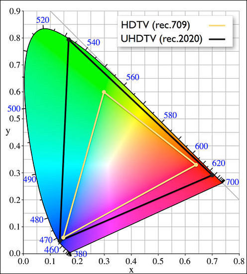 在色域三角形方面可見 BT.2020 色域標準所佔的面積遠遠大於 Rec.709 標準的範圍,亦表示 BT.2020 色域標準能顯示更多色彩,令畫面色彩更為豐富及分明