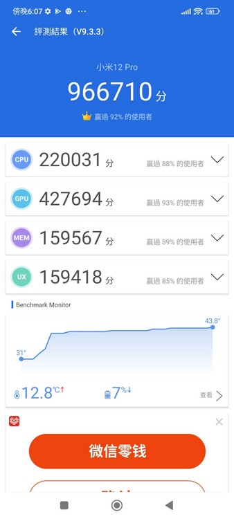 ▲Antutu 跑分成績約為 966710 分,屬今年 Android 機頂級規格