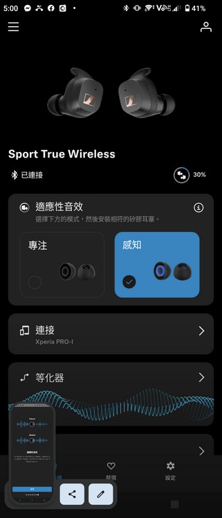 Sennheiser Sport True Wireless 支援連接 Smart Control App 使用,App 內可手動切換專注模式與感知模式,前者主要在運動時使用,可提高隔音效果 (需用黑色網面耳膠);後者在休閒時使用,隔音能力較低,可提高對周遭環境的聲音察覺 (需用黑藍色耳膠),App 內亦可手動設定 EQ,以及使用校音功能,建立個人化的 EQ 設定。