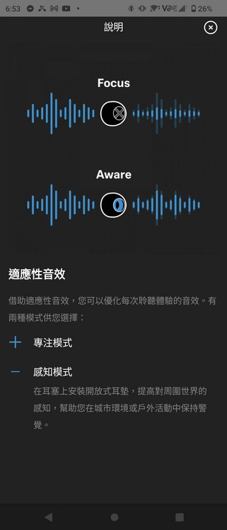 ▲App 內可手動切換專注模式與感知模式