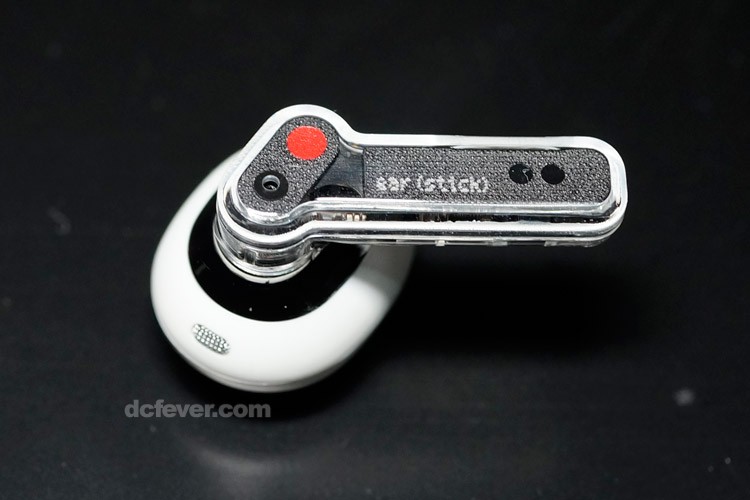 獲得 IP54 防水規格的 Nothing Ear stick 仍是大玩透明概念,棍仔部份採用透明設計,可以按壓操作。耳機部份改用了半入耳式設計,橢圓形的耳機殼是從 100 位試用者測試後改良而成,以筆者戴平頭塞時很易脫下的耳型,試戴 Nothing Ear stick