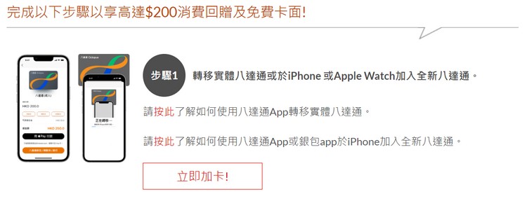 由 2022 年 12 月 8 日至 2023 年 1 月 7 日的推廣期內,新客戶幾實體八達通,加入 iPhone 或 Apple Watch 並登記,由加卡日起計的 30 日內以此八達通作的消費交易可獲 10 %回贈,最高可獲 HK$200 八達通增值額 (即需要消費 HK$2,000)。大家可根據以下 5 個步驟,就能登記。