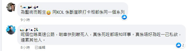 該帖文最先在連登討論區被轉載,初時留言主要圍繞在攝影相關話題。及後帖文被轉載到多個汽車及駕駛相關的 Facebook 群組,留言焦點也轉向至道路安全上。不少網民提到該處車速通常很高,而且拍攝位置剛好在彎位上,不排除有大意的司機沒有留神,無察覺到馬路上忽然有人在拍照,最終釀成意外,既傷害自己,亦連累其他人!