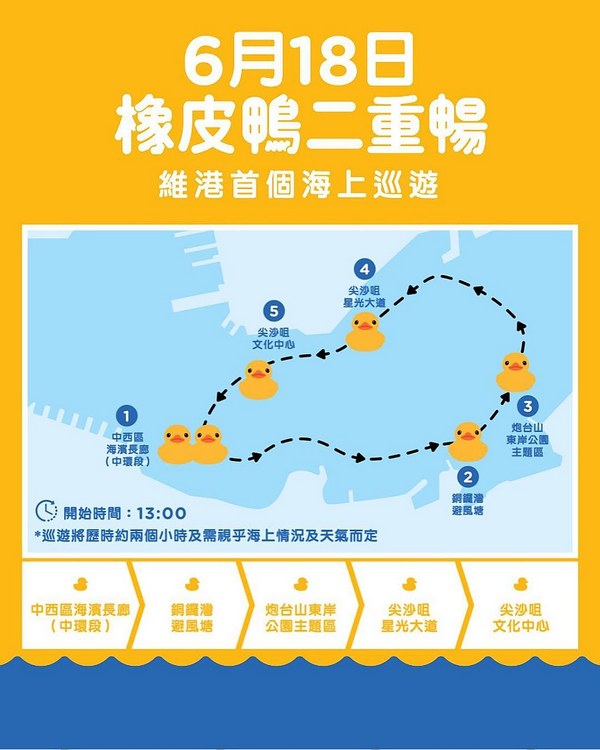 本周日亦是父親節,其中一隻小黃鴨會在下午一時從中環出發,以反時針方向沿維港作海上巡遊,途中會經過銅鑼灣避風塘、炮台山東岸公園、尖沙咀星光大道、尖沙咀星光大道及文化中心,最後返回中環海濱長廊,歷時大約 2 小時。要留意的是,巡遊活動會視乎海上情況及天氣而隨發作出變更。根據香港天文台的天氣預報,周日會吹西南風 4 至 5 級,大致多雲,有幾陣驟雨,初時局部地區有雷暴。日間短暫時間有陽光。