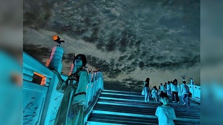 相傳人死後,魂魄首先經過鬼門關,然後踏上黃泉路,路的盡頭有條忘川河。想過河就要走上奈何橋。照片中,穿白色長裙的女子來到「奈何橋」,無論橋的另一端是正準備遞上熱湯的孟婆,還是她想在喝下孟婆湯前對今生的最後一次回望,都能感受到她依依不捨與眷戀的心情。畢境下了橋喝過孟婆湯,前世回憶統統煙消雲散,了無牽掛進入下一世輪迴。