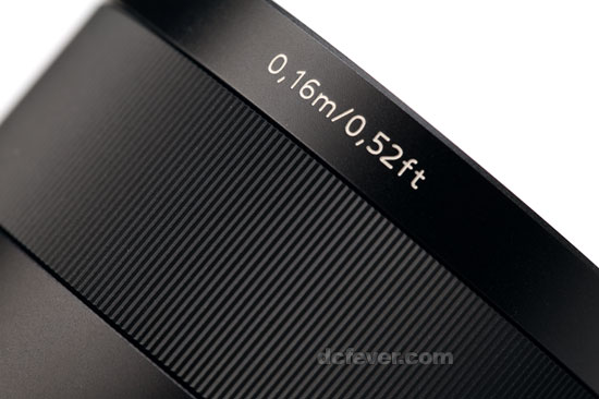 鏡頭尺寸跟 18-55mm kit 鏡相若,重量為 225 克,不算是大塊頭,鏡頭左則設有藍色 Zeiss 銘牌以凸顯高貴身份,正前方近鏡片位置刻有紅色 T* 鍍膜標記,感覺十分專業。至於濾鏡尺寸則為 49mm,跟大部分 E-Mount 鏡頭一樣,方便同一濾鏡如 CPL 可以用在不同鏡頭上。