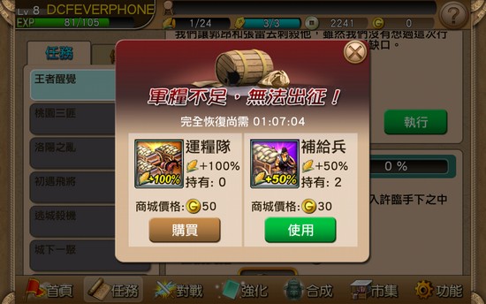執行任務時需要一定軍糧,不足時可透過升級、購買 G 幣或時間等待去補充軍糧