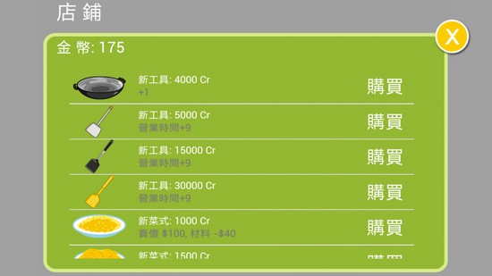 完成遊戲可獲得金錢,讓玩家可為廚房添置更多廚具及學習更多菜色供顧客品嚐