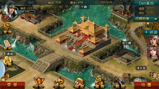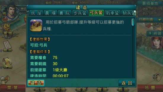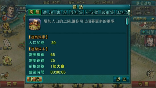 玩家需要在領地大興土木,建立農場及房屋,增加城池內的人口及糧食