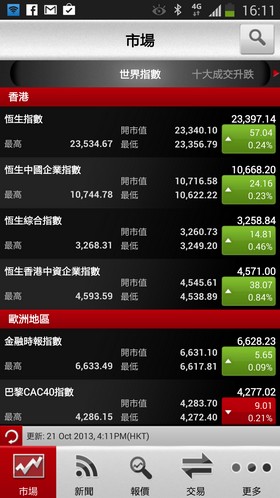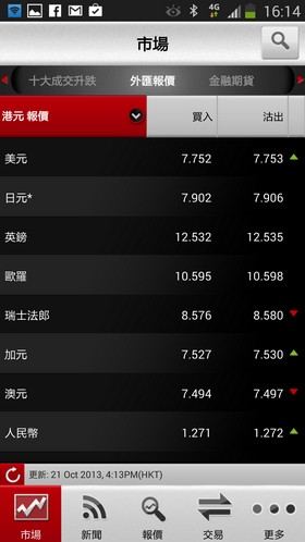 SHKF eMO! 除了有不同的股市資訊外,用家還可即時查閱各大市場指數數據、港股股價、外幣匯率等。如在「鴻財網」開立證券交易帳戶,更可於 SHKF eMO! 作即時買賣及設定到價提示等功能。