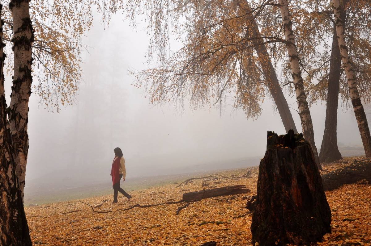 雨雾中的白桦林