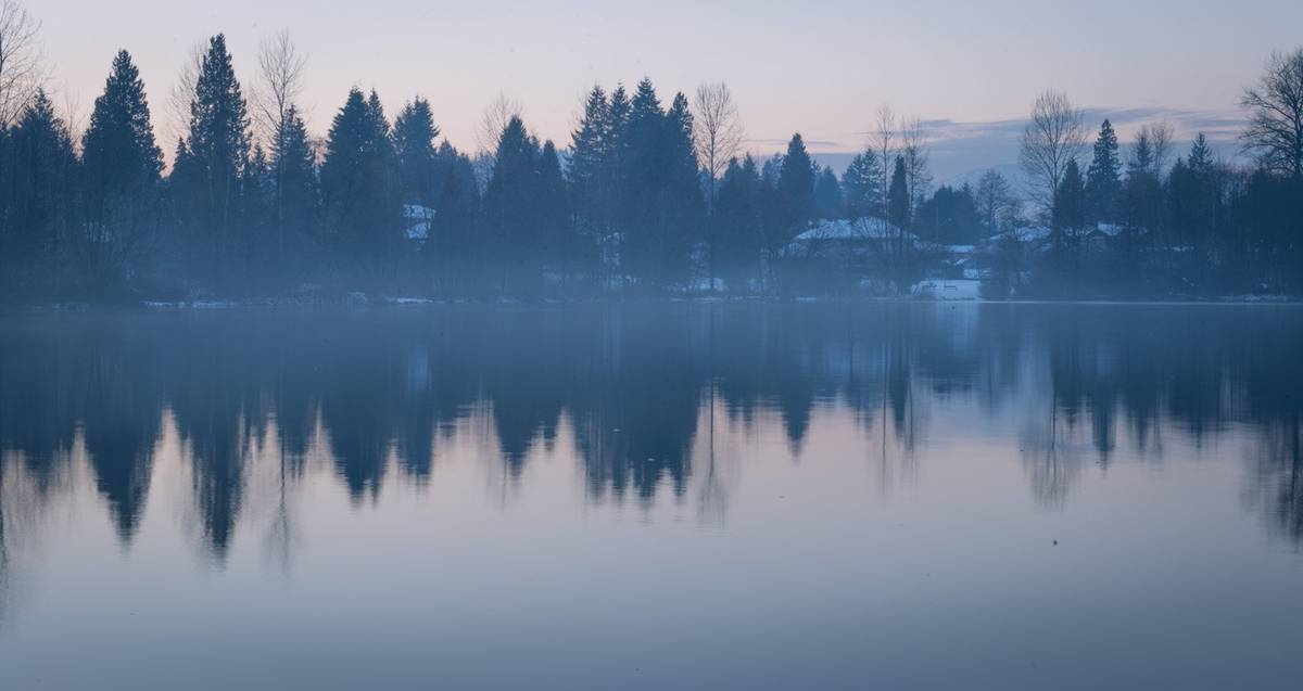 小雪後的黃昏, 霧泛湖面, 景迷色褪.