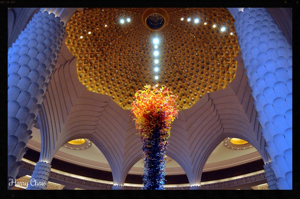 (亞特蘭蒂斯酒店),以傳說中的失落海底古城亞特蘭蒂斯為藍本,大堂就如傳說中的奢華宮殿,中庭置有美國著名藝術家Dale Chihuly打造、猶如巨型噴泉的玻璃雕塑,四周則圍滿壁畫,活像向你訴說古城的故事。