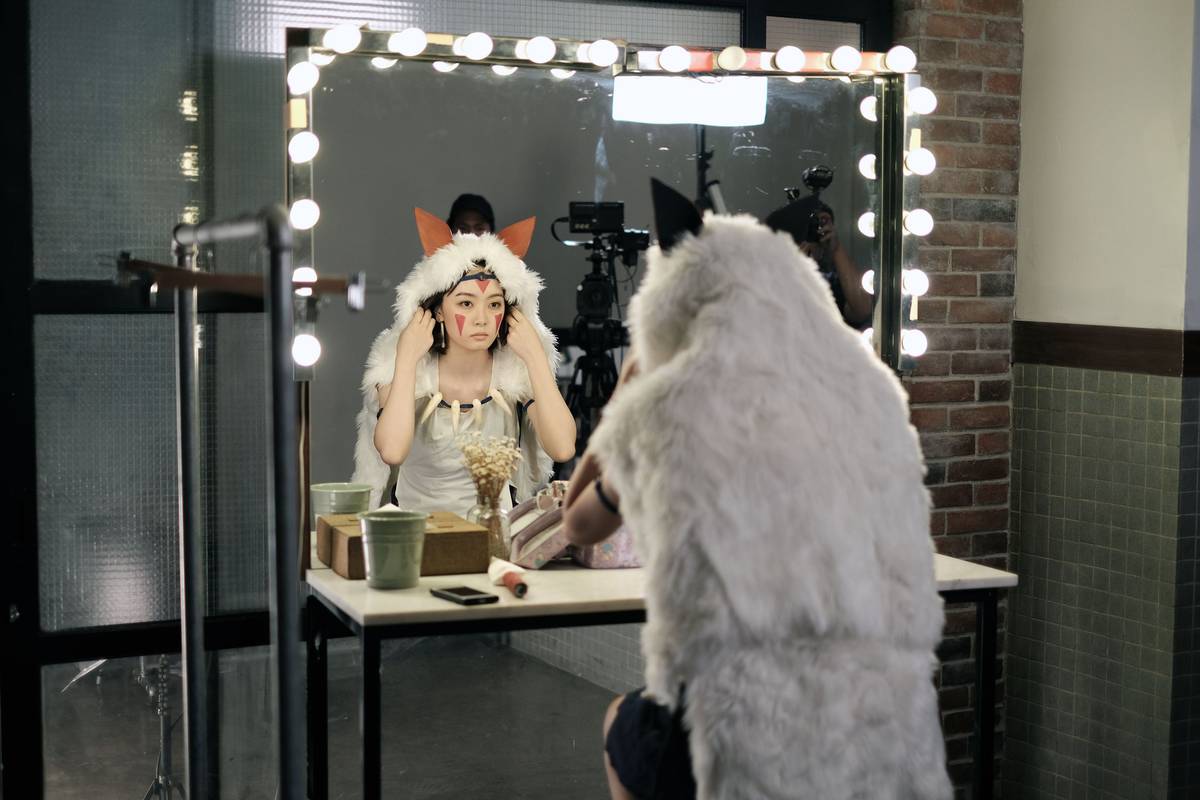 從中學時代已開始參與cosplay的Shiki,也有參加舞團表演和兼職模特兒,所以早已習慣面對鏡頭。 例如我只簡單籠統地向她表示要「開心」,她亦能夠應付自如擺出數種笑容,例如瞇眼露齒笑、裝鬼臉笑,更會擺出配合「幽靈公主」角色的姿勢,讓拍攝工作順暢了不少。