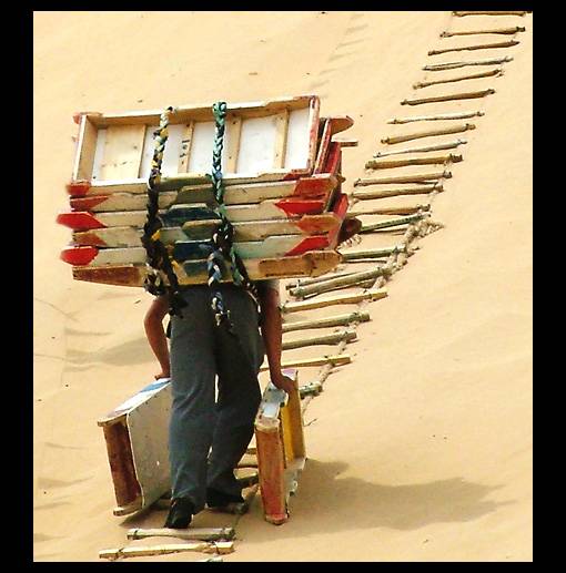 我在鳴沙山見過同一情景,個人覺得他們有點笨,其實在上面放下長繩慢慢拉上去,山腳只要一個同事負責鉤住幾架便可,繩過長可分三四段,最重要是不用每次都搬動自己身體重量丫馬。