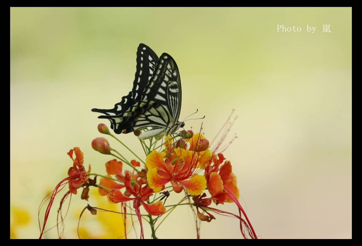 高高的洋金鳳樹上, 美麗的花朵吸引了柑橘鳳蝶高飛去採.......