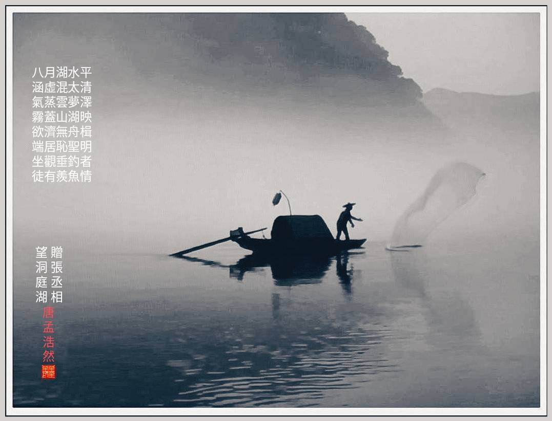 湖南郴州東江湖 八月湖水平 涵虛混太清 氣蒸雲夢澤 <波撼岳陽城> 欲濟無舟楫 端居恥聖明 坐觀垂釣者 徒有羨魚情 以上為原詩 摘自 唐 孟浩然 [ 望洞庭湖 贈 張丞相 ] < >內,小弟以「霧蓋山湖映」代之! 謝謝點評了!