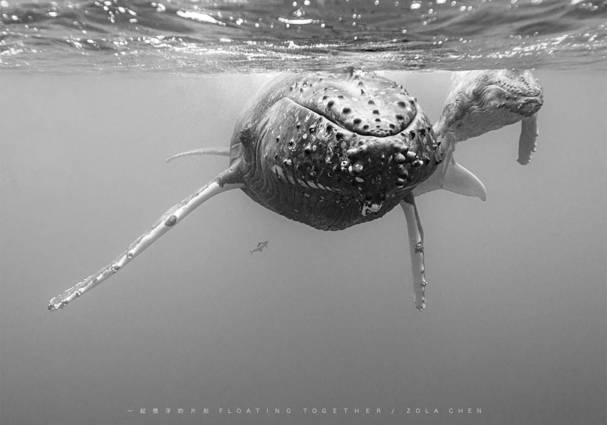 鯨魚媽媽身上很明顯的有藤壺的痕跡,也有諸多刮痕,對照鯨魚寶寶則剛出生沒多久,身上也很乾淨,刮痕也很少。當媽媽把鯨魚寶寶放在靠近我們這一側,也許表示媽媽信任我們對寶寶不會造成威脅。