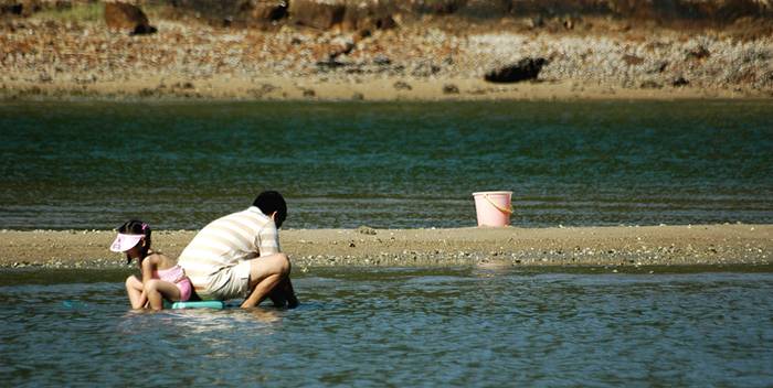 兩父在赤柱的一個淺灘中掘蜆, 兩人靠著對方, 忙著打撈當晚的"晚餐\".