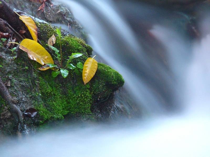 Fallen leaves and flowing water should occupy the frame evenly.