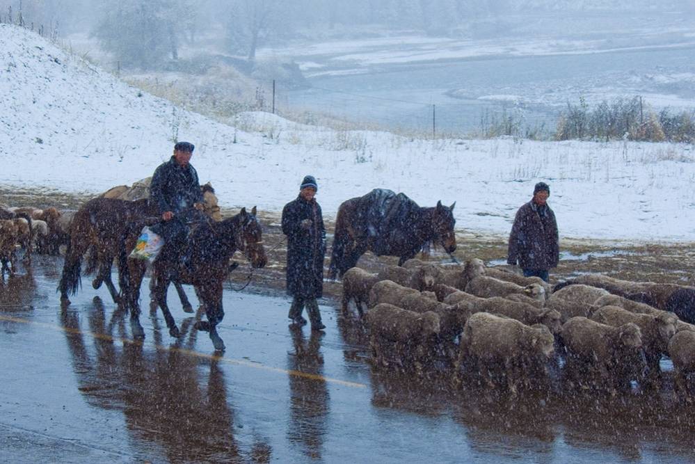 牧人冒著風雪, 趕羊下山