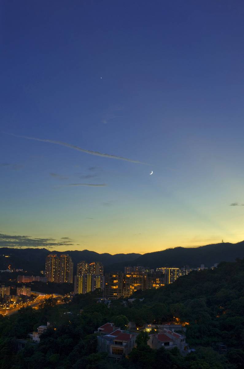 晚霞未盡, 一輪彎月急不及待出來了