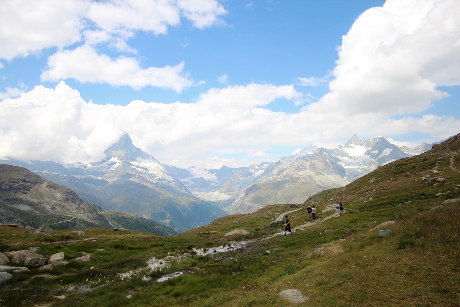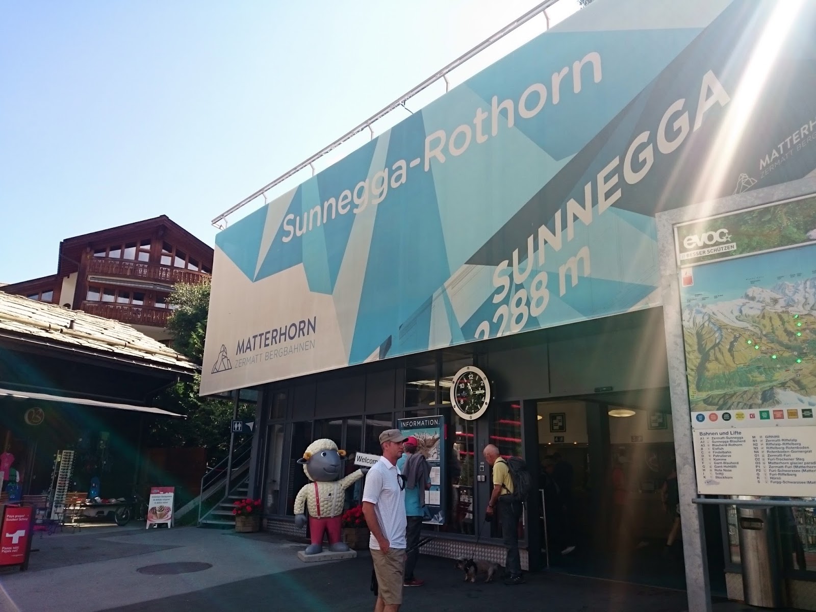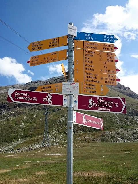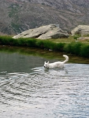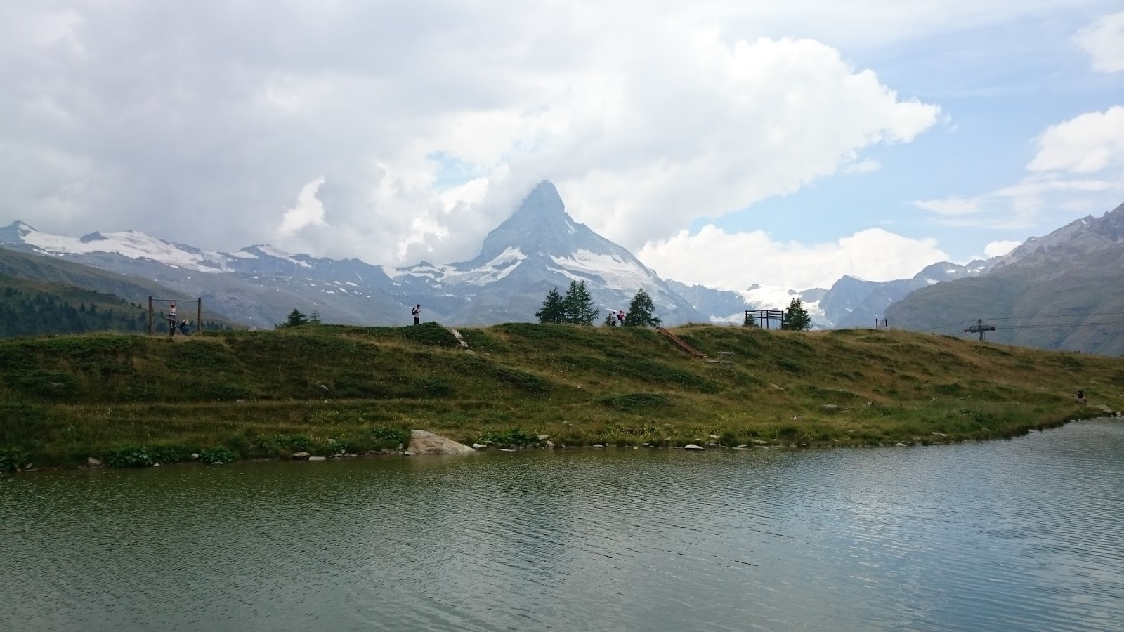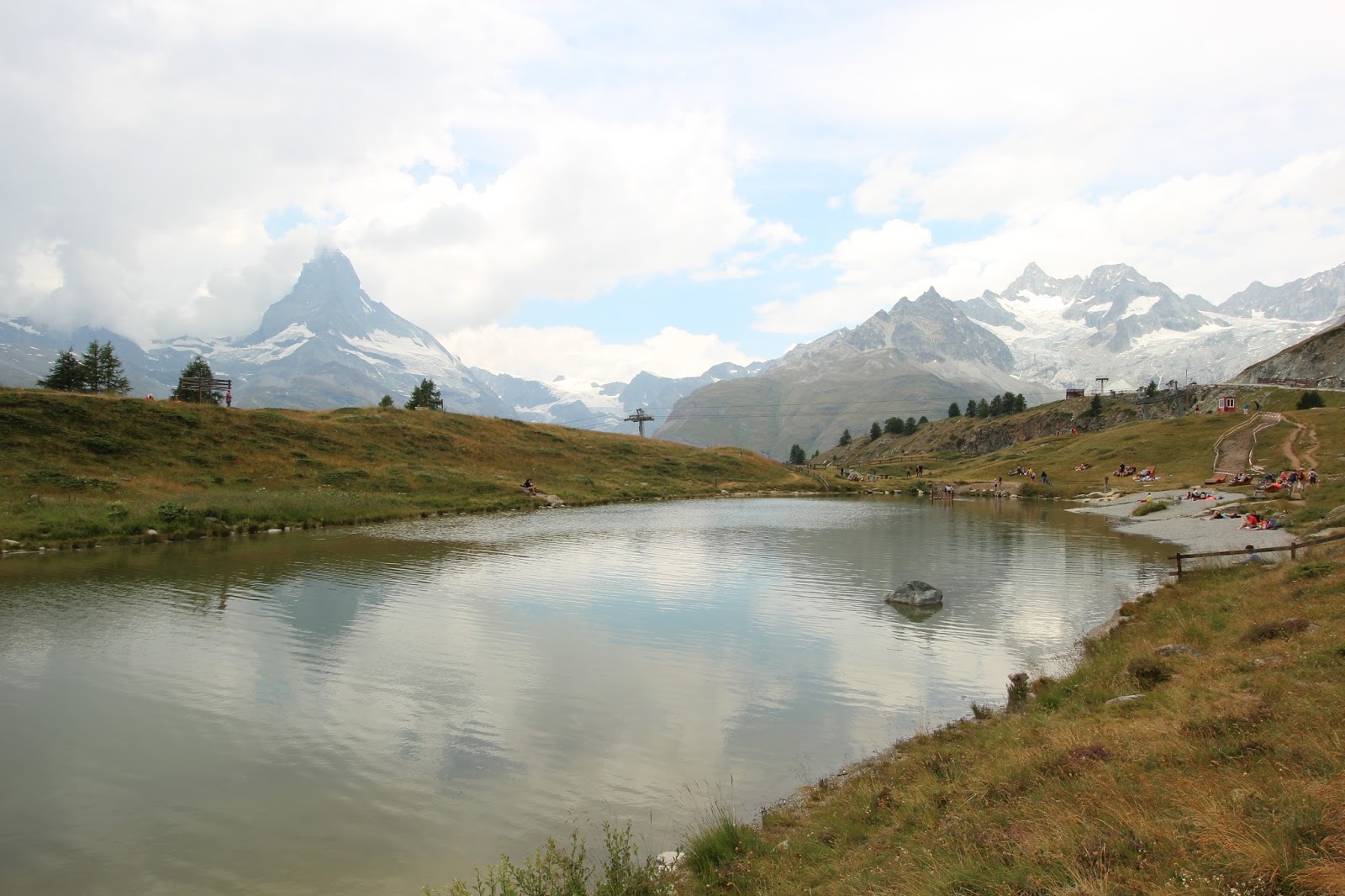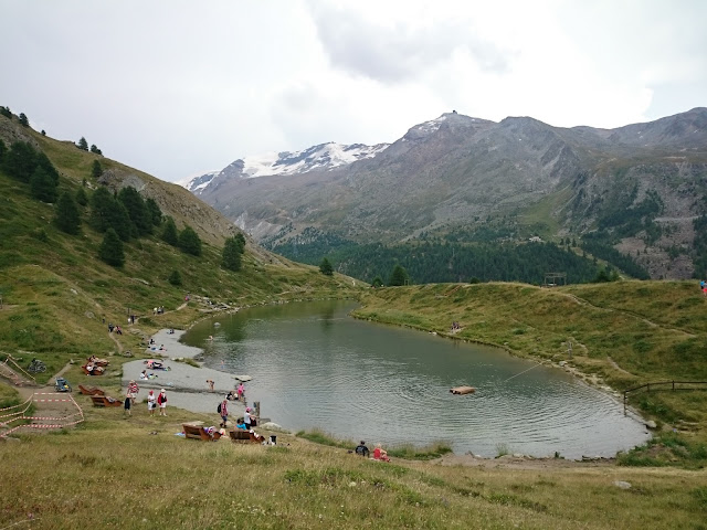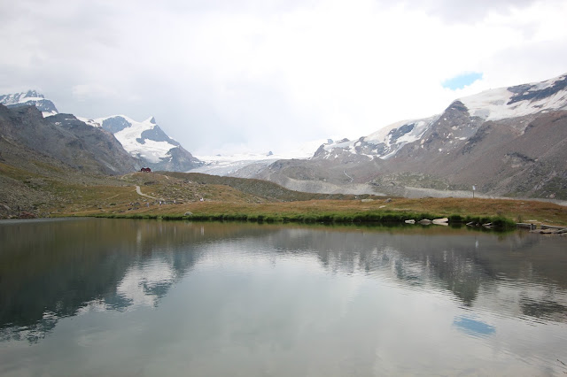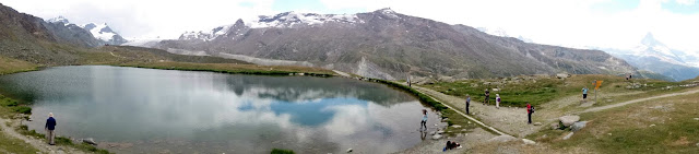 沿途都是日本人(昨天在Gornergrat 已碰見很多日本健行人士,日本人果然是愛好大自然的民族),路牌顯示步行十五分鐘就可到達Stellisee湖,這裡的路明顯比昨天的平坦,對於肌肉疲累的我也可以輕鬆地走,顯示牌也不假,十五分鐘左右就找到Stellisee,倒影相當對稱(雖然有點暗)! 大自然的美真的不能用文字解釋,要親身來到才能感受得到!哈哈,狗狗也忍不住衝落湖中!原路折返纜車站,見到兩隻黑面羊,唔知點解牠倆離了群,剛坐纜車上來的時候,還看見一大群黑面羊在纜車站底陰暗處躲避太陽!