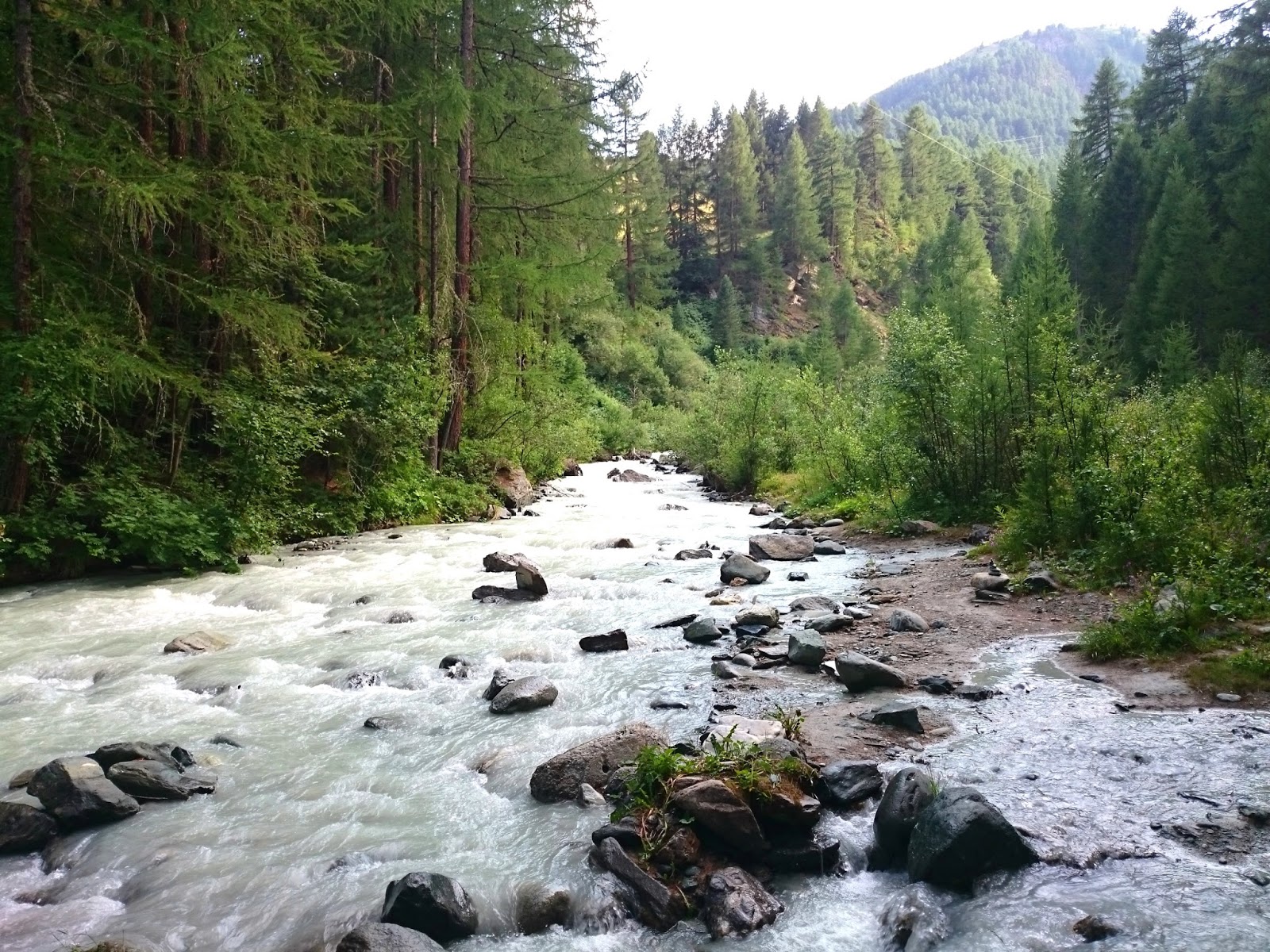 就這樣,一個人走進了開始陰暗的樹林,在不知前路是否正確的時候,經過一個小瀑布,相信這就是河的源頭,突然發現有兩個人,還請我幫忙拍照 ,荒山野嶺都遇到我,我當然唔會拒絕。拍完照,我就繼續U turn,過河後應該找對路了,開始落山方向,跟著纜車的電纜線走,纜車都已經停了。突然間有三個亞洲人於屋仔出門,似乎要下山,應該是兒子推著坐輪椅的媽媽,他的太太就走在前面,在這樣的碎石路,我沒有爬山鞋走下去也感到艱難,他推著輪椅怎樣下去呢?又怎樣上來呢?可能後面有車路吧!