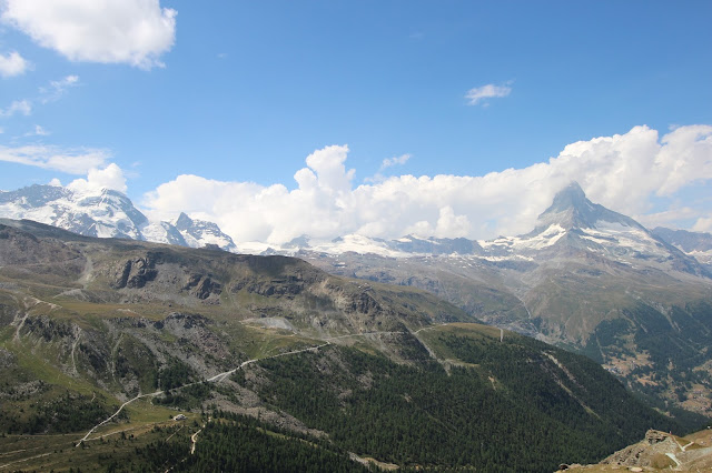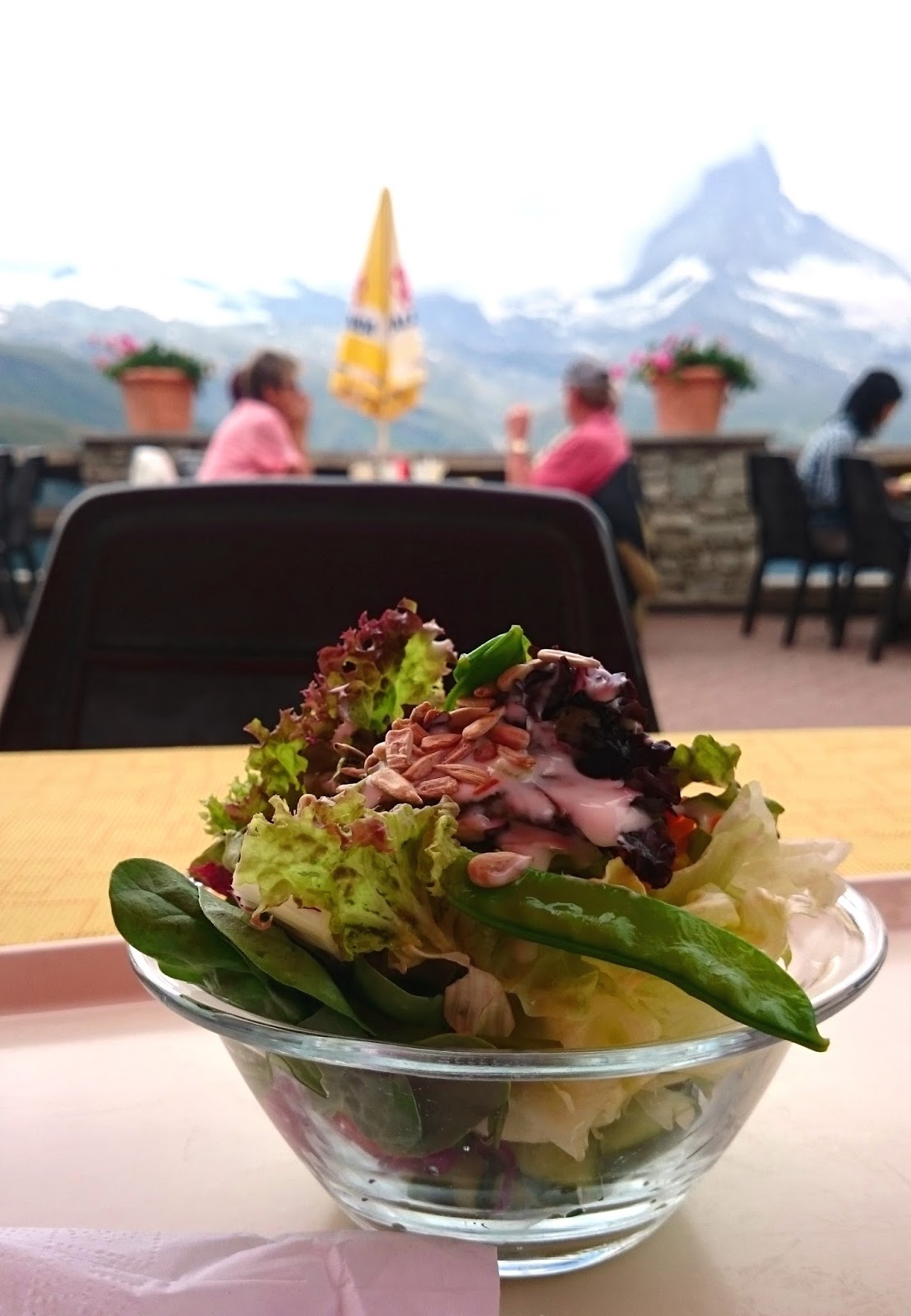 坐吊車回Sunnegga, 已經是lunch 的時候,於餐廳買個small salad,自助式就好似以前pizzahut 一樣自己堆滿一碗,哈哈,雖然是細碗,堆呀堆,也塞得滿滿的!坐在露天茶座,望著馬特洪峰食沙律,感覺更加清新,味道都特別自然!