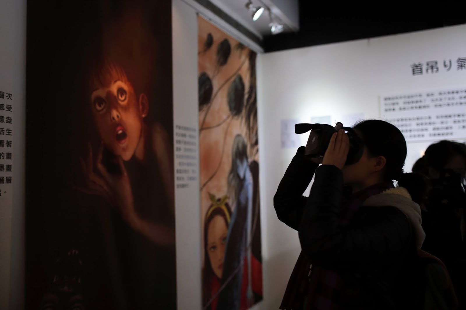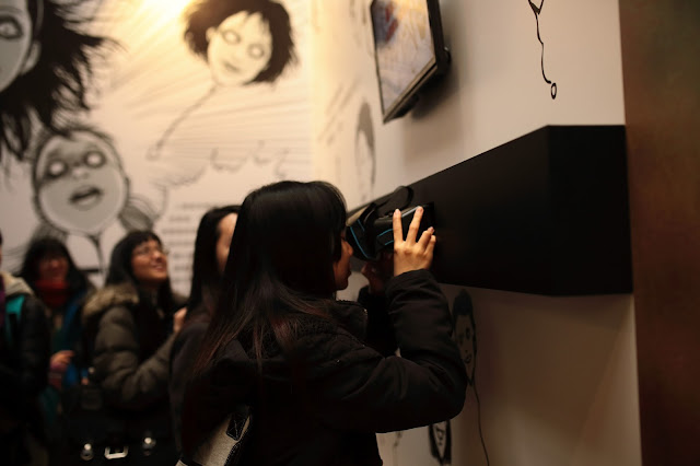 今次場展用左AR系統 ,將「伊藤潤二AR」 apps裝好0係手提電話之後,工作人員就智將大家部手提電話放落展方0既眼鏡到,咁就可以0係場內睇一D貼有AR貼紙嘅展品lu~