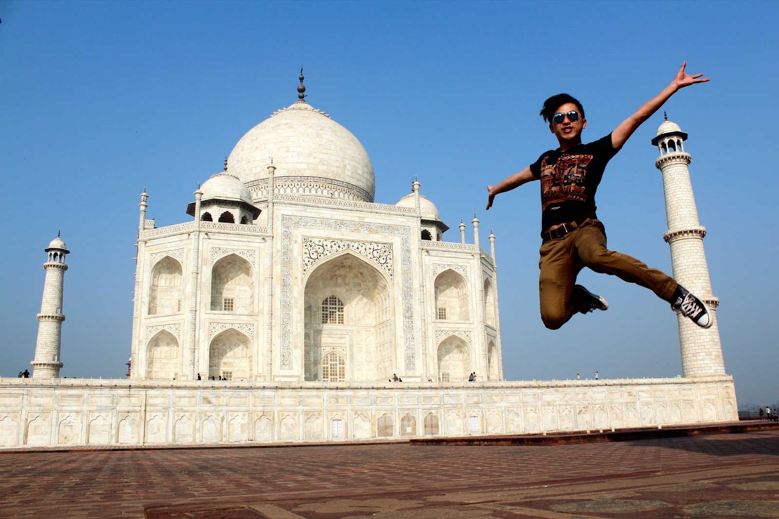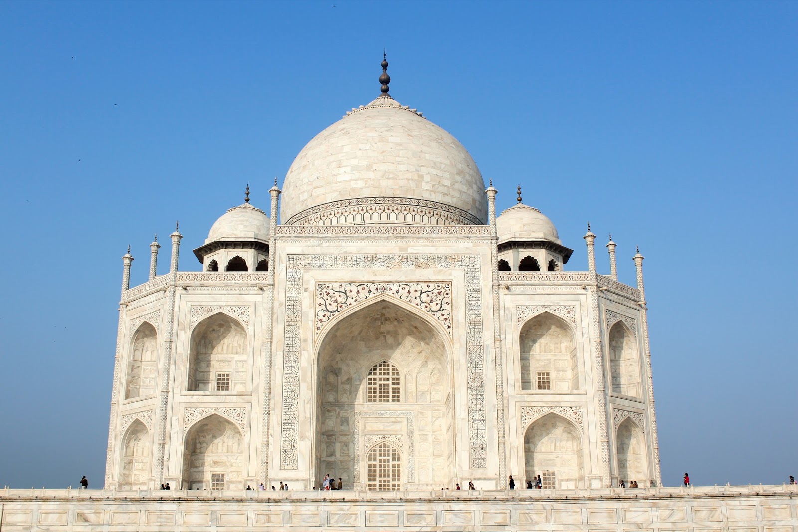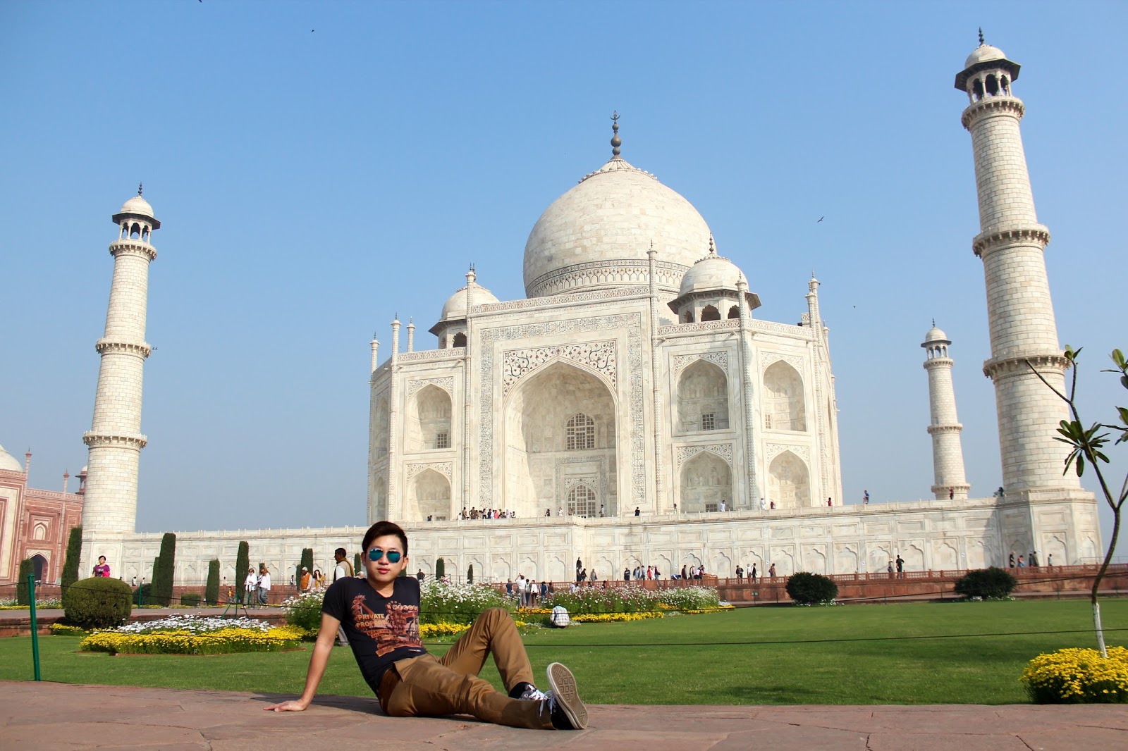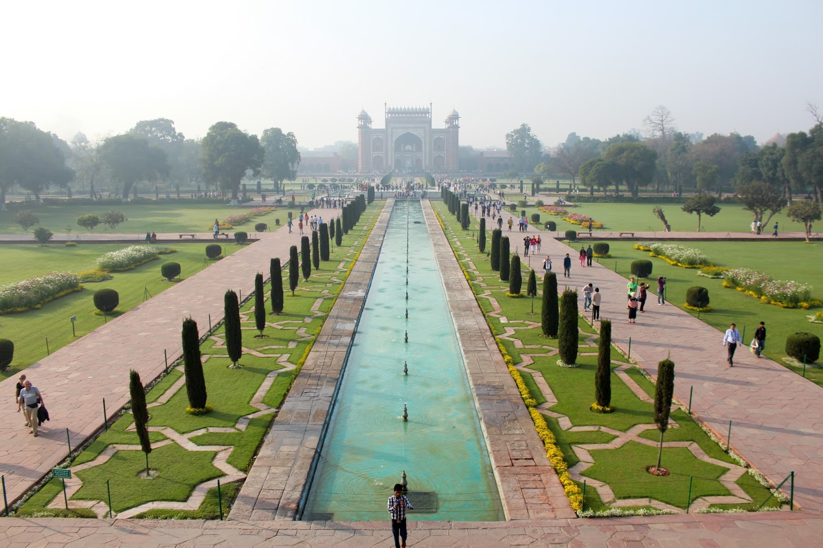 來到紅色的泰姬陵入口,在黑暗中慢慢看見那潔白的泰姬陵,不禁令人注目!將視線下移就是堆滿了人的拍照位,用最禮貌的方式跟著那無形的秩序,終於拍到了那個倒影,在壓力下似乎拍得不太理想…