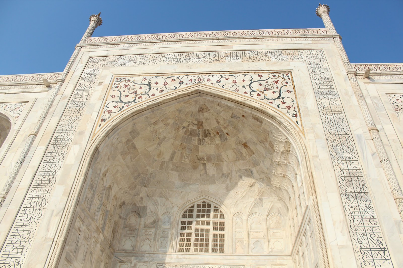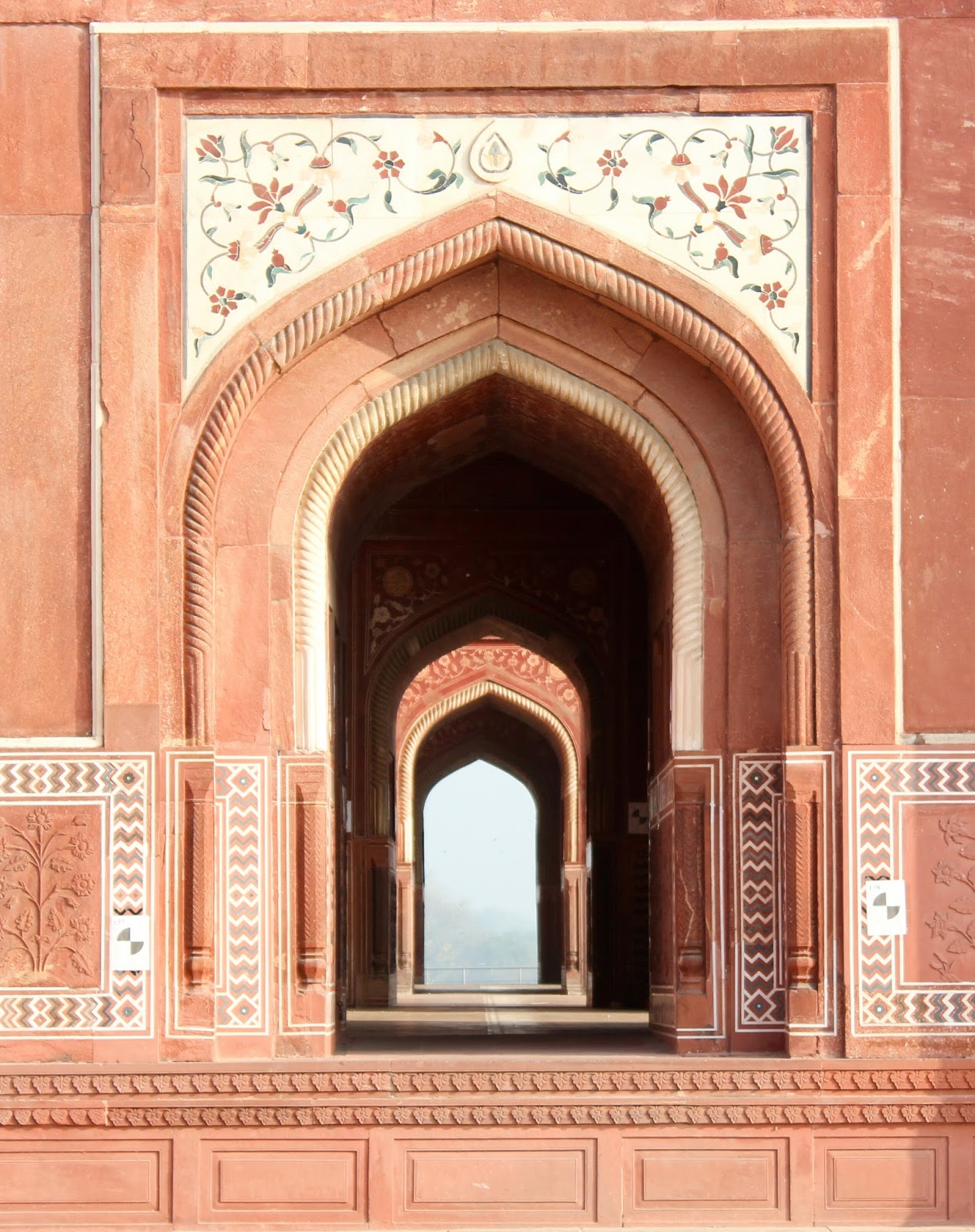 進入泰姬陵主體要穿鞋套,內裡不能拍照,有兩副石棺,據聞真的石棺在地下室。主體外有四座尖塔,左右兩邊皆有清真寺,似乎對稱就是整個園區的建築風格。