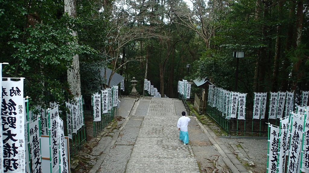 我只係知以外貌來分辨既話,本宮大社以綠色為主色,由入口鳥居至參道至百步梯都插滿一支支白色旗幟,只係個氣勢已經夠勁揪!