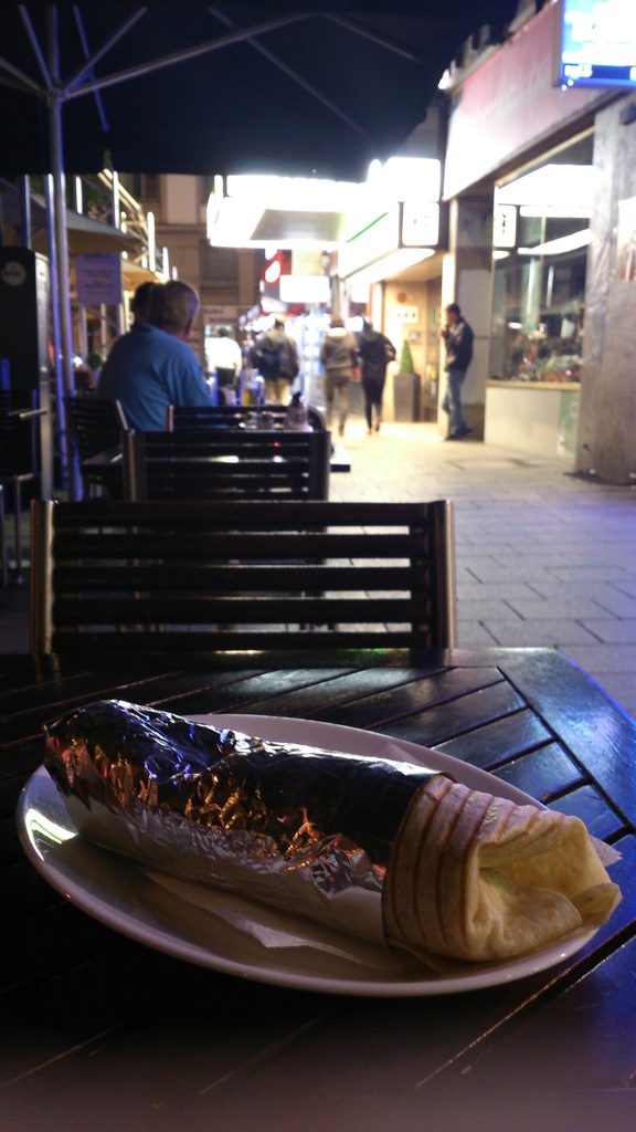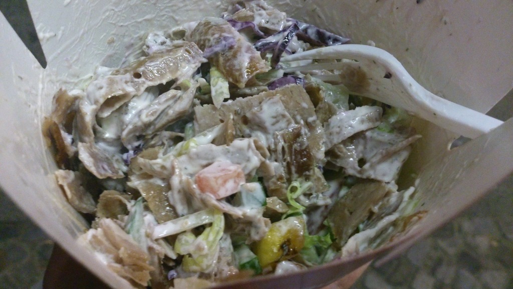 幻想下, 一大束烤得啪啪聲的大肉卷(好似用錯擬聲詞),散發微微焦香後立刻被新鮮割下,配上各種新鮮蔬菜及乳酪蒜香醬汁,被一大塊燙熱薄餅包成長長一條,一啖咬下,肉的鮮美、蔬菜的爽脆、醬汁的香濃, 所有滋味一次過從口裡爆發而出!........
