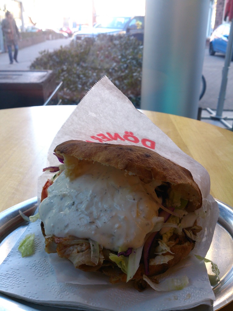 關於döner kebap既來源眾說紛紜,有個德國佬同我講話土耳其本身無呢樣野,係一個土耳其移民係德國創出嚟後流傳全世界的。於是我問問維基王,原來土耳其本身係有呢樣食物的,但而家一般係歐洲以至世界流行既Kebab版本的確係由一名土耳其人於70年代係柏林發明的 ; 等於壽司係日本國寶,但立於頂點既紅豆壽司則由香港發揚光大咁解