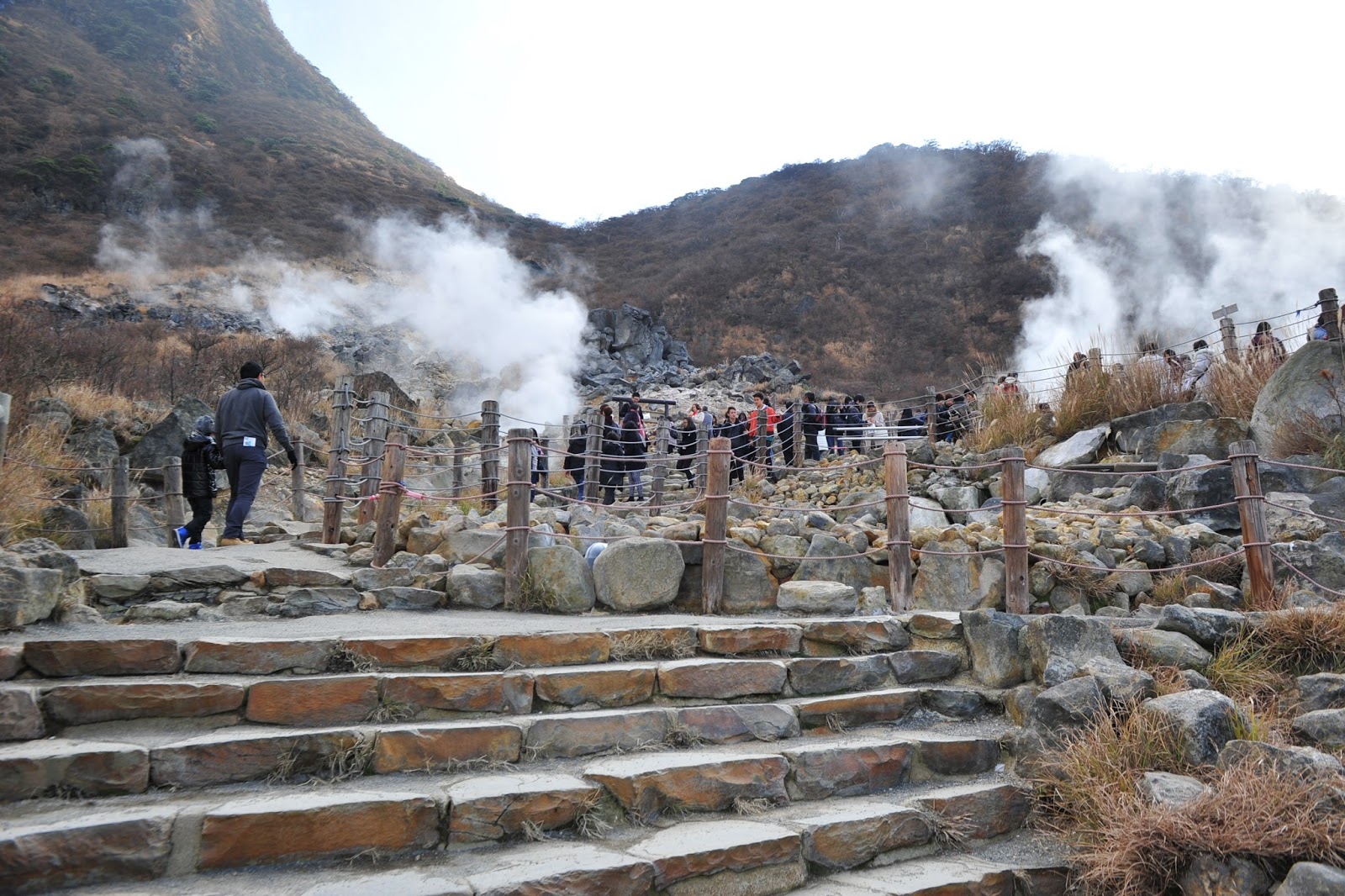 上岸後行往大湧谷。那裡有很多地熱洞,冒出很多白煙,硫磺味非常重。