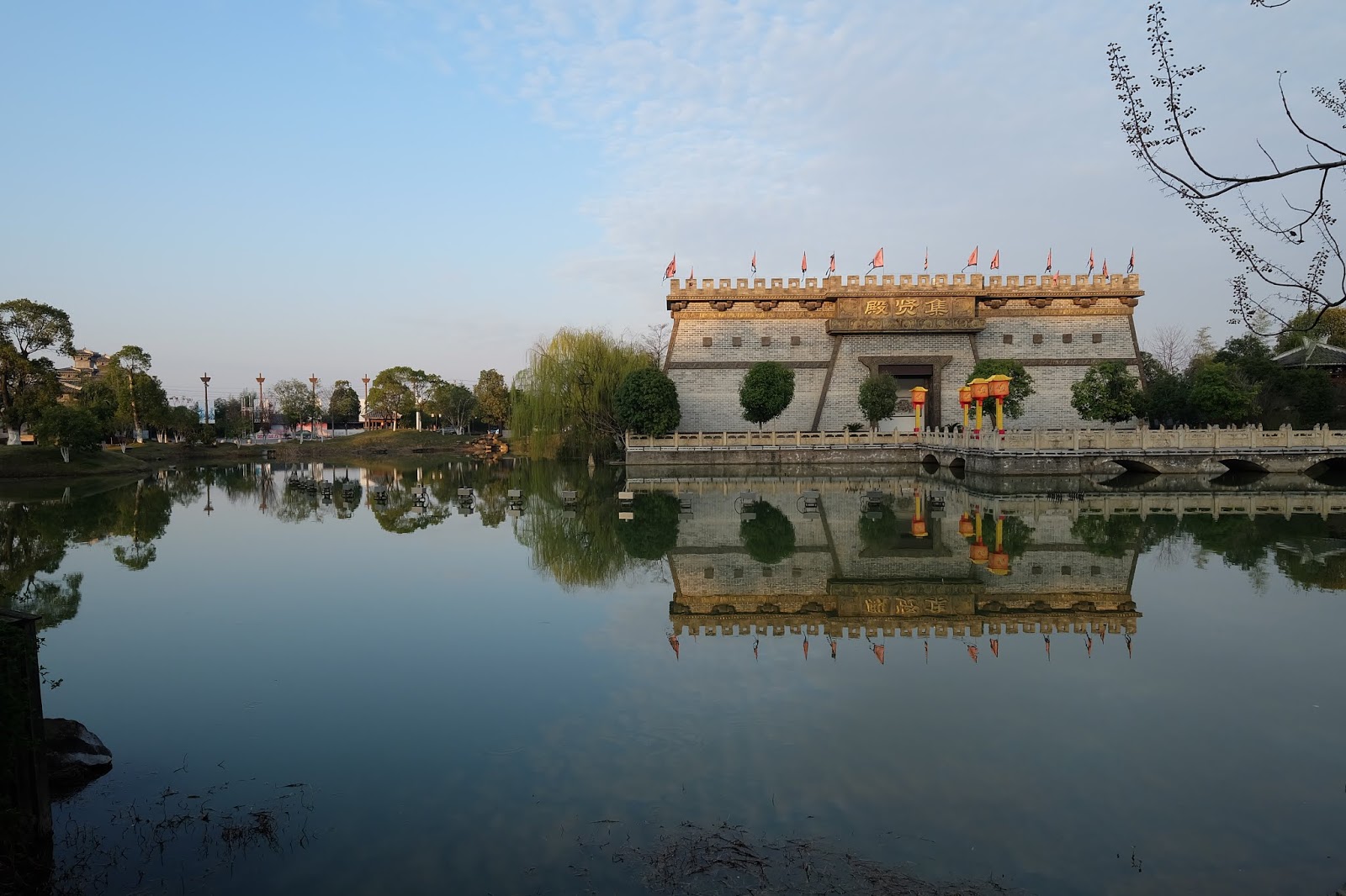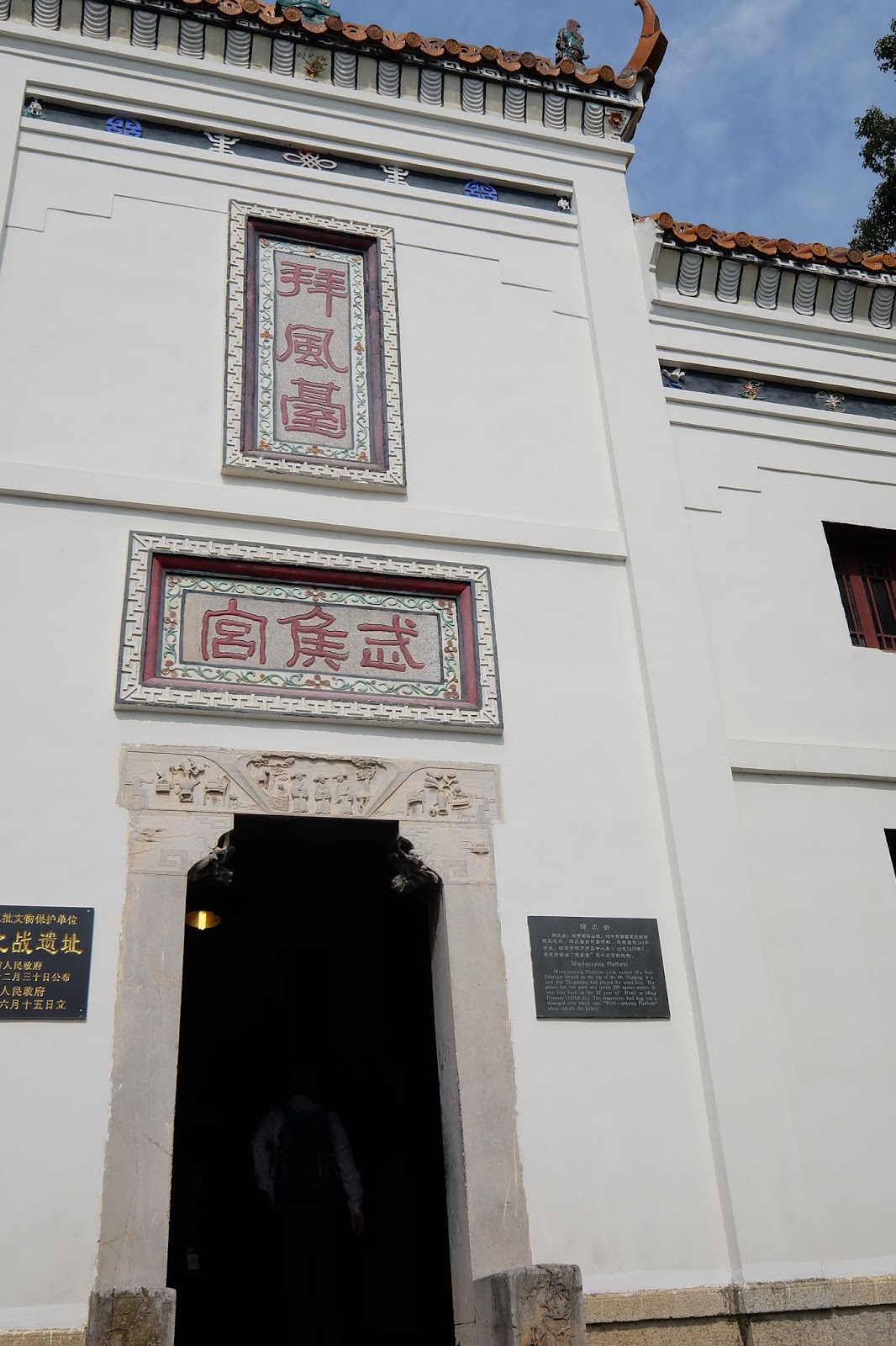 下圖為武侯宮,武侯宮初建於宋朝,相傳是諸葛亮在赤壁之戰中,借東風的地方,因此又稱「拜風臺」。 1936年重建時還發掘出土了一件殘字石碑,據專家考證,殘碑上原本應刻有「拜風臺」三個大字。