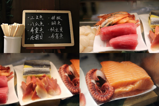 三文魚八爪魚希靈魚,甜蝦,北寄貝等八款,即點即切比你,唔係預切放到乾淨淨個種,食落鮮度OK架