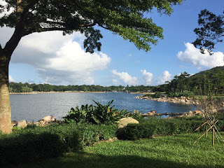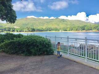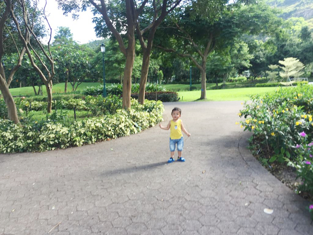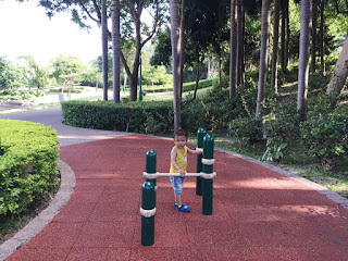 歇息後我們慢慢沿著悠閒小徑閒逛,小徑旁邊亦有一個又一個的小荷花池,但小猪誤會了以為可以嬉水,示意要走下去!