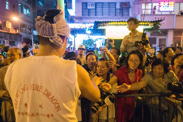 要真正感受節日的氣氛、火龍的活力,不可不提大坑火龍在橫街小巷穿插的環節。火龍巡遊隊伍會舞著火龍游走大坑村內所有街道,拍照的、舞龍的,人群追著火龍在村內奔跑,在火龍散發的熱力之中歡樂地追逐;這也是我的習慣,看火龍後要汗流浹背才滿足。