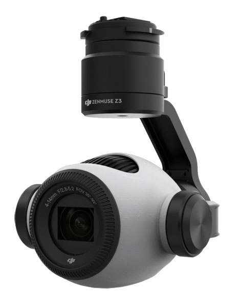 影片。廠方宣稱新一代的防震能力可讓變焦鏡頭安穩操作,更適合工業上的應用。相對舊有航拍機,要近拍人物或物件時,必需要控制航拍機飛近,但 Zenmuse Z3 將可維持原有高度同時作特寫,更為方便,而且對於搜索、救援或遠距離偵查等工作時,可保持距離之餘又可提供清晰影像,相當實用。