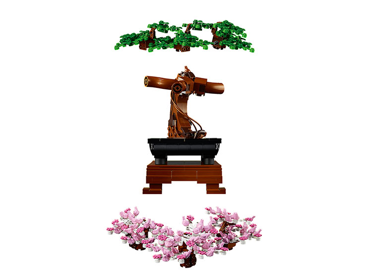 觀乎官圖,這副 LEGO 用的都是常用零件,例如底座與花盆簡單以零顆粒的長形磚組成,樹的零件與先前的 LEGO 21318 樹屋相若,透過大量弧面磚、平面磚勾勒出樹幹的不規則線條。另外,葉片是常見於聖誕樹盒裝內的叉形綠色組件,玩家可自由拼砌,並加入粉色櫻花以創造出各種盆景造型,玩時毋須參考說明書,可以完全 DIY 發揮創意。