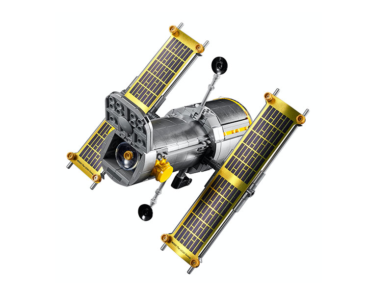 再看望遠鏡部分,雖然官方沒有提供實際尺寸,但觀乎它完全佔用了穿梭機的載重艙空間,可預期具有一定份量。它以帶有銀色亮面質感的組件堆砌而成,塗裝以 LEGO 來說非常罕見,打開艙門更找到金色的太陽能板,十分搶眼!另外,望遠鏡前端是光圈門所在,揭開便是觀測儀,結構幾可弄真,不得不佩服廠方心思。