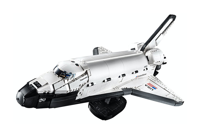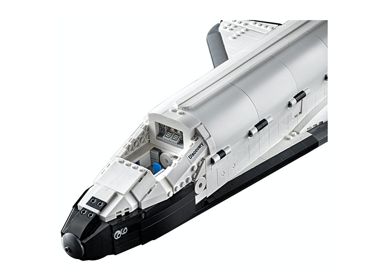 這副 LEGO 屬於成人向的 Creator Expert 系列,全套共有 2,354 個組件。穿梭機本體長 54cm、寛 34cm、高 21cm,黑白機身、流線型鼻錐、兩側三角翼、垂直穩定翼與主引擎都有很高還原度;當中載重艙的圓拱形上蓋與駕駛艙的擋風部分均為新組件,並可拆下來以展示內部的機械手臂與機組人員座位。主要機關有兩個,一是機底的起落架,可以同步伸縮;二是機尾引擎,旋轉即可控制副翼擺動,帶來一定玩味。