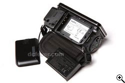 電池在機底,使用 DB-L50 充電池,全高清攝錄時可使用 120 分鏡,降低解像度可加長時間。