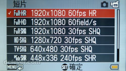 短片解像度豐富,全高清也有三種包括 60p、60i 及 30p,留意容量上會有分別。 |