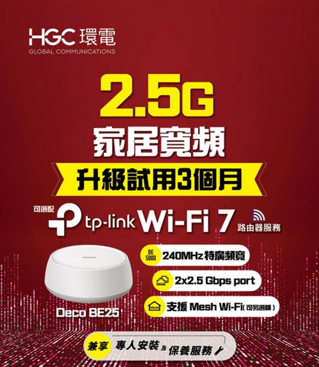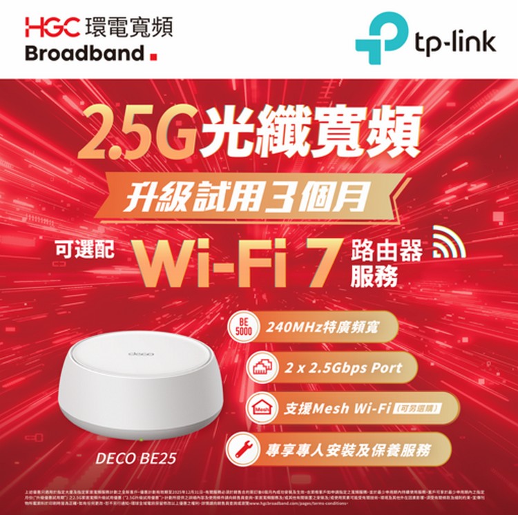 配合 HGC 2.5G 寬頻服務,TP-Link Deco BE25 能進一步體現高速傳輸優勢。服務提供上下載最高 2500Mbps 速度,對於追求低時延及高效率的家庭,能有效提升整體上網體驗。新客戶或現有用戶如有意體驗 Wi‑Fi 7 與 2.5G 網絡,現可申請三個月 TP-Link Deco BE25 免費試用,評估實際需求後再作決定。