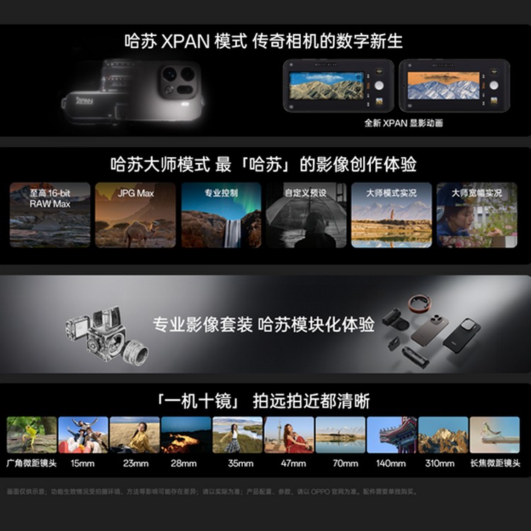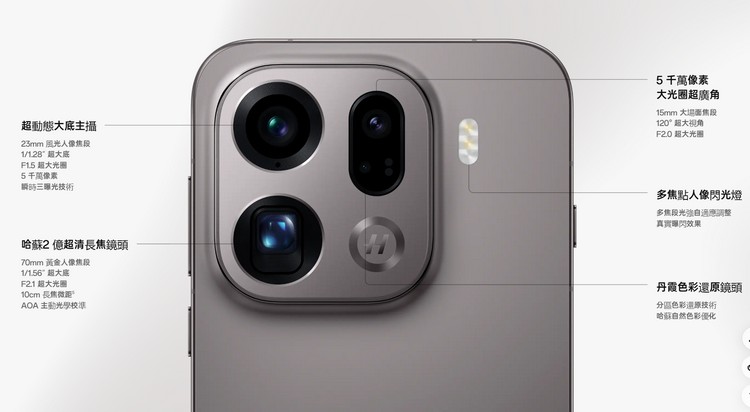此外,新機支援 XPan 模式、自然膚色算法 3.0、AI Portrait Engine 等高端攝影功能,在人像與夜景表現上有顯著提升。影片拍攝支援 4K 120fps、10-bit 色深 HDR10+,甚至支援類似電影膠片的 XDR 動態記錄。OPPO 還推出專屬攝影週邊配件,包括 Hasselblad 認證的 230mm 增距鏡頭、磁吸式手柄與原廠濾鏡套裝,為專業創作者打造完整的手機攝影生態。